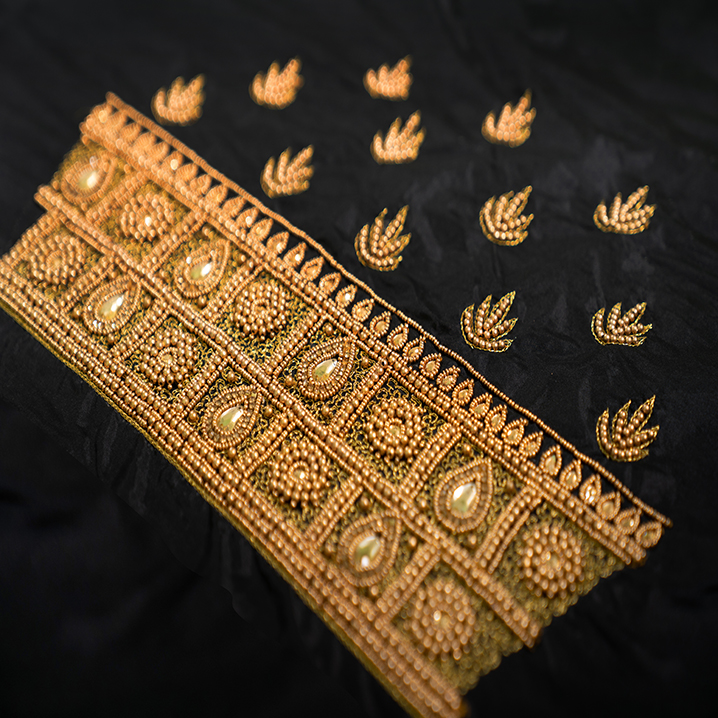 Aari work needlework uses beads and stones to give clothing and accessories a glittering appearance. These decorations are organised to create an intrinsic web-like design, giving the piece a natural appearance.